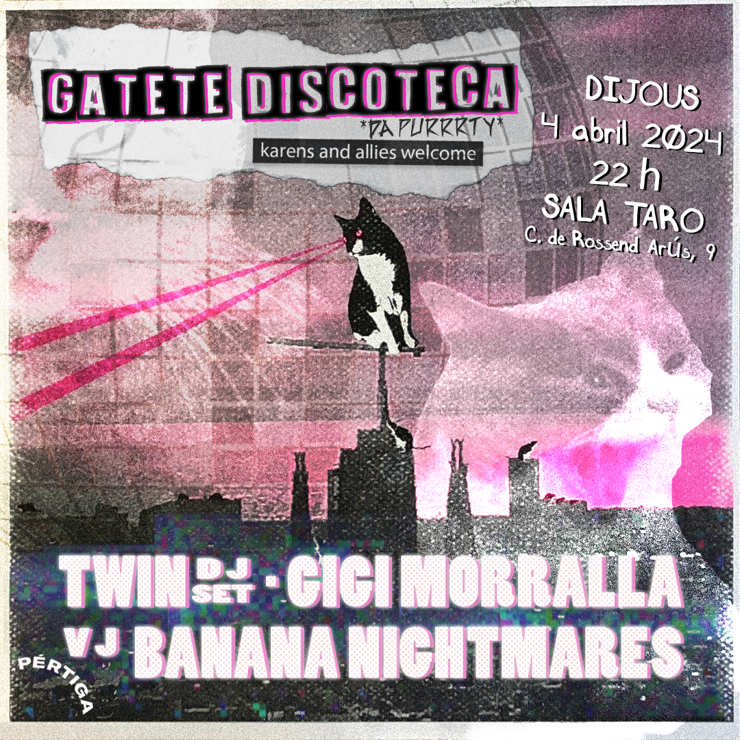 «Gatete discoteca» és una celebració del moviment erràtic, anàrquic, espontani i espasmòdic en la pista de ball. Una invocació col·lectiva a l’arbitrarietat que ens conforma, a la dansa descompassada de molècules i ions. Al xocar, el frec, l’espetegar, el repicar. A la contracció i expansió dels cossos. Una invitació a lliscar-nos entre visuals desprotegits de coherència, i sons orquestrats des del ‘jaleo’. Un caos cerimonial. És la festa que no requereix experiència ni coneixements previs.